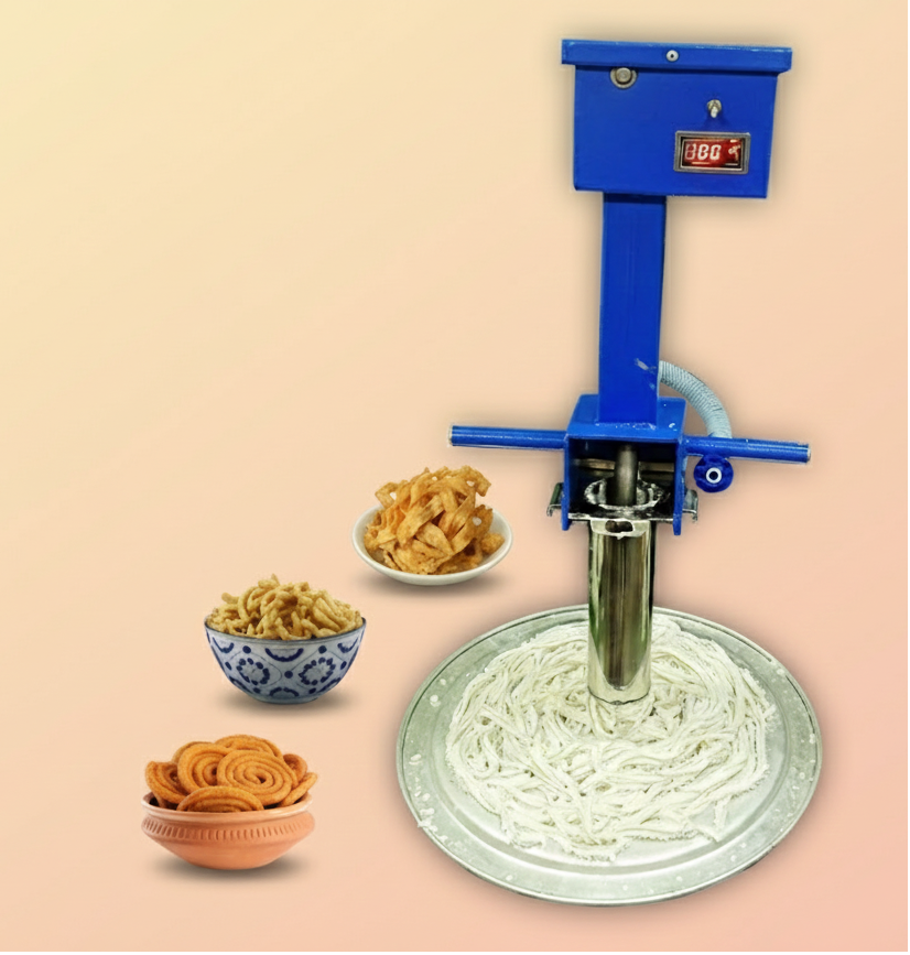The Hanging Murukku Machine is a high-performance commercial kitchen solution engineered to streamline and standardize the production of traditional extruded snacks such as murukku, chakli, and similar savory treats. Designed for efficiency, consistency, and ease of operation, this machine significantly reduces manual effort while increasing output and product uniformity. Built with a Direct Feed to Tawa/Kadai system, the machine is suspended directly above the frying vessel (Tawa/Kadai or kadhai), allowing freshly extruded dough to drop straight into hot oil. This direct dispensing mechanism ensures precise shaping, minimal handling, and improved hygiene, while maintaining the authentic texture and quality of traditional snacks. Ideal for commercial kitchens, sweet shops, catering units, and large-scale snack manufacturers, the Hanging Murukku Machine enhances productivity, reduces labor dependency, and delivers consistent results batch after batch.